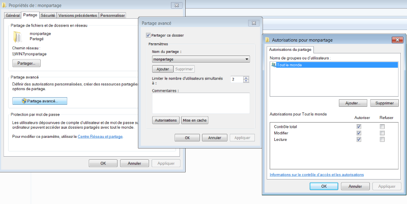 Quand on partage sous Linux, ça paraît compliqué (faut personnaliser le fichier smb.conf) mais sous windows c'est pire :