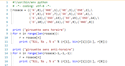 rosace = (('N',0, 'La Tramontane'),('NNE',1, 'La Tramontane Grecque'), ….Tu pourrais aussi aller plus loin en définissant tes vents comme des objets d’un objet girouette (exemple d’évolution du de codage ici)